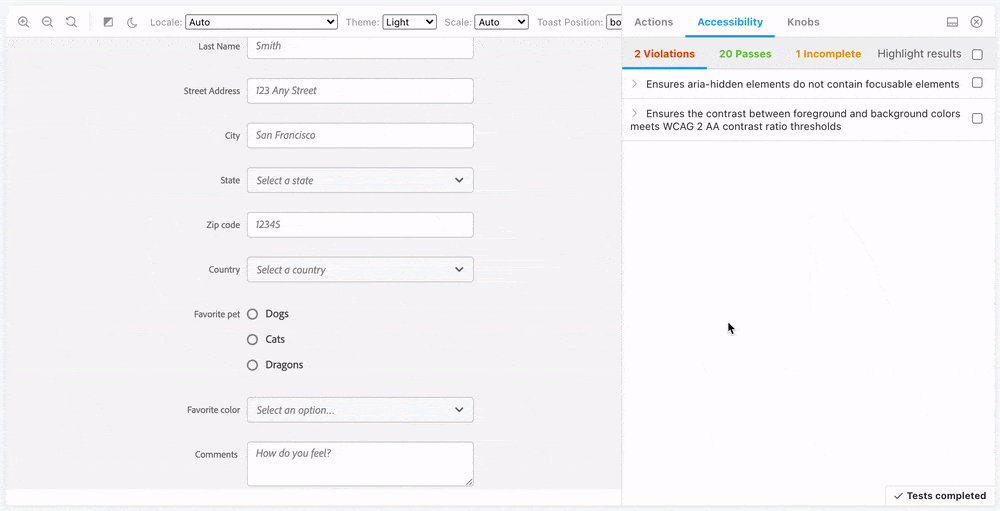 Storybook’s Accessibility runs Axe on the active story. It visualizes the test results in a panel and outlines all DOM nodes that have a violation.