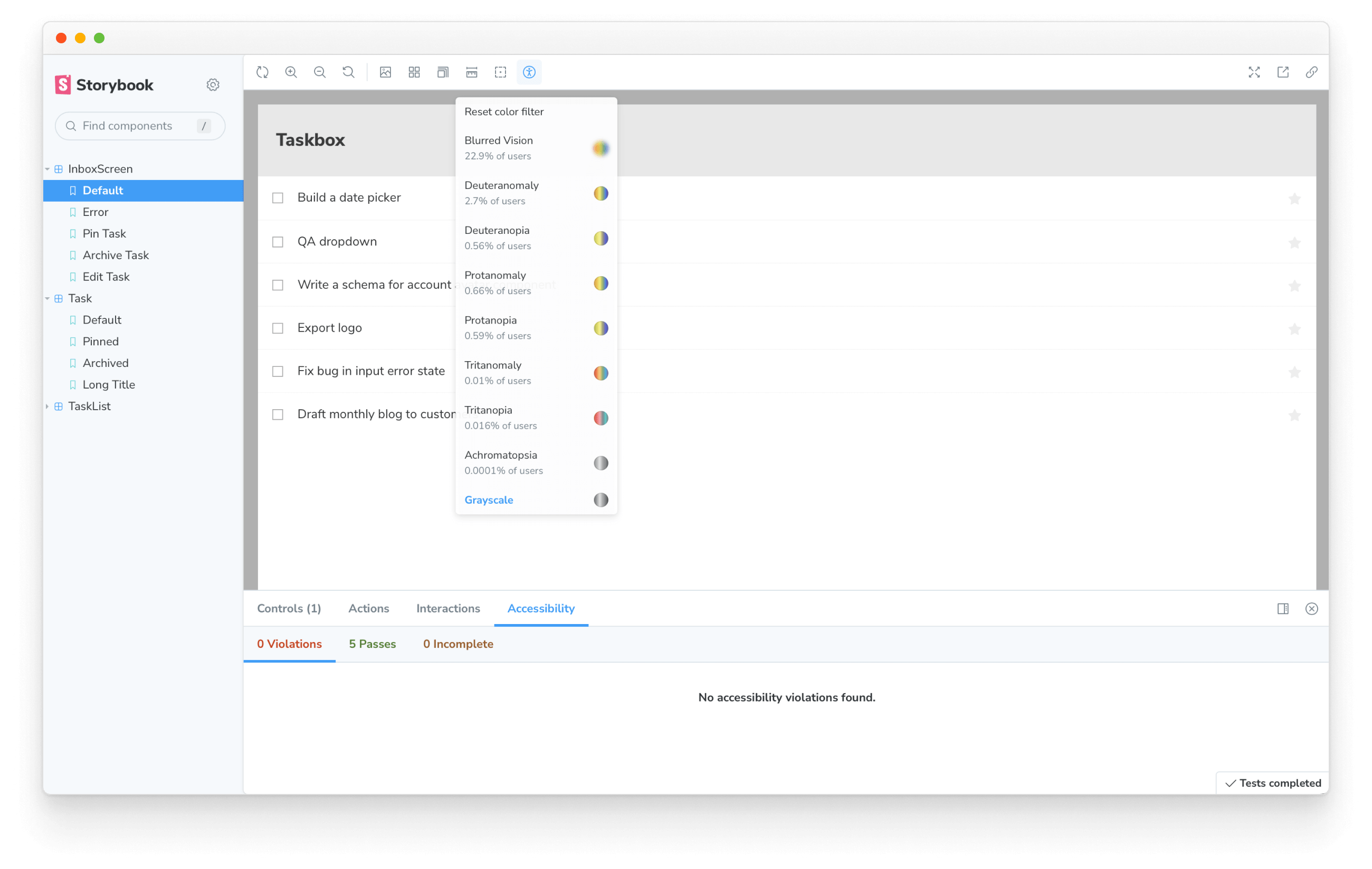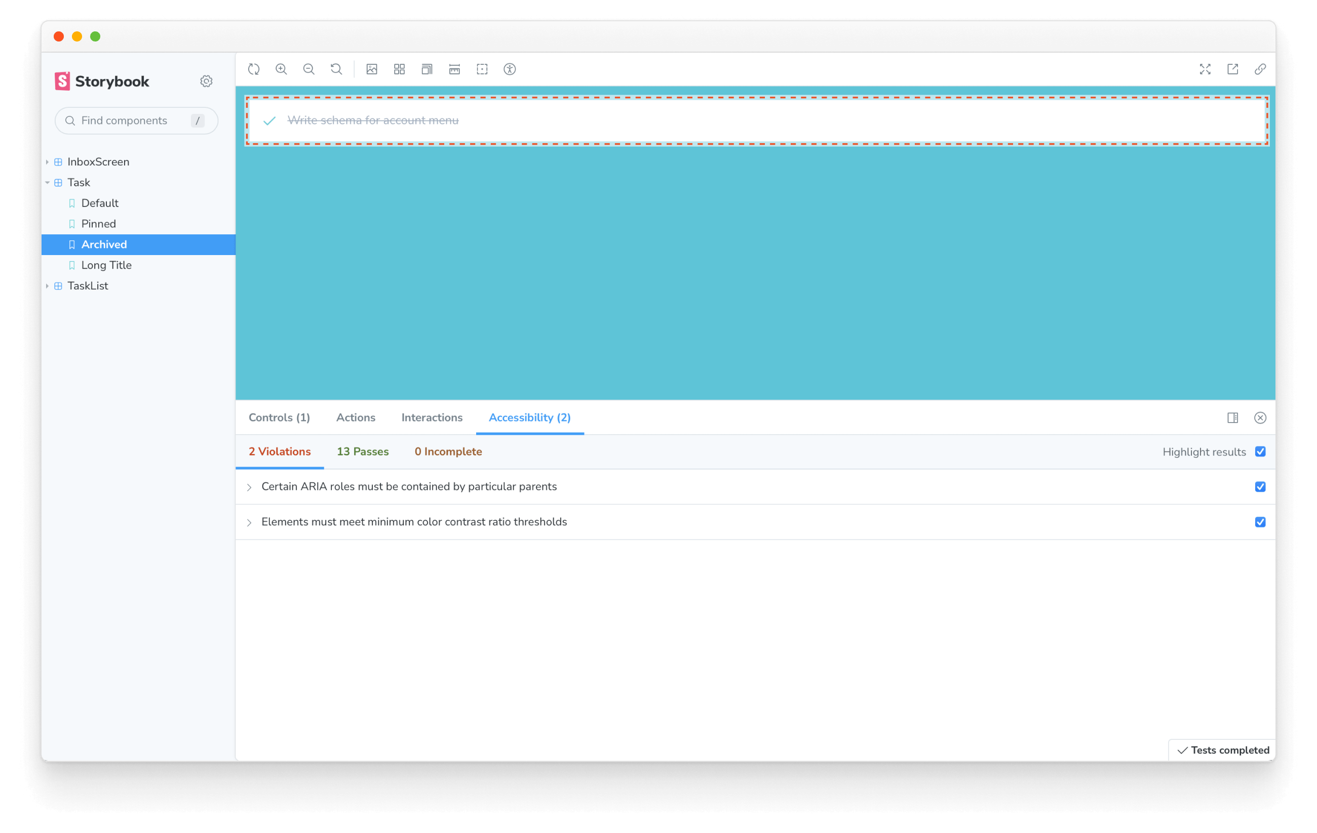 We've already isolated the Task component and captured all its use cases as stories. During the development phase, you can cycle through these stories to spot accessibility issues.