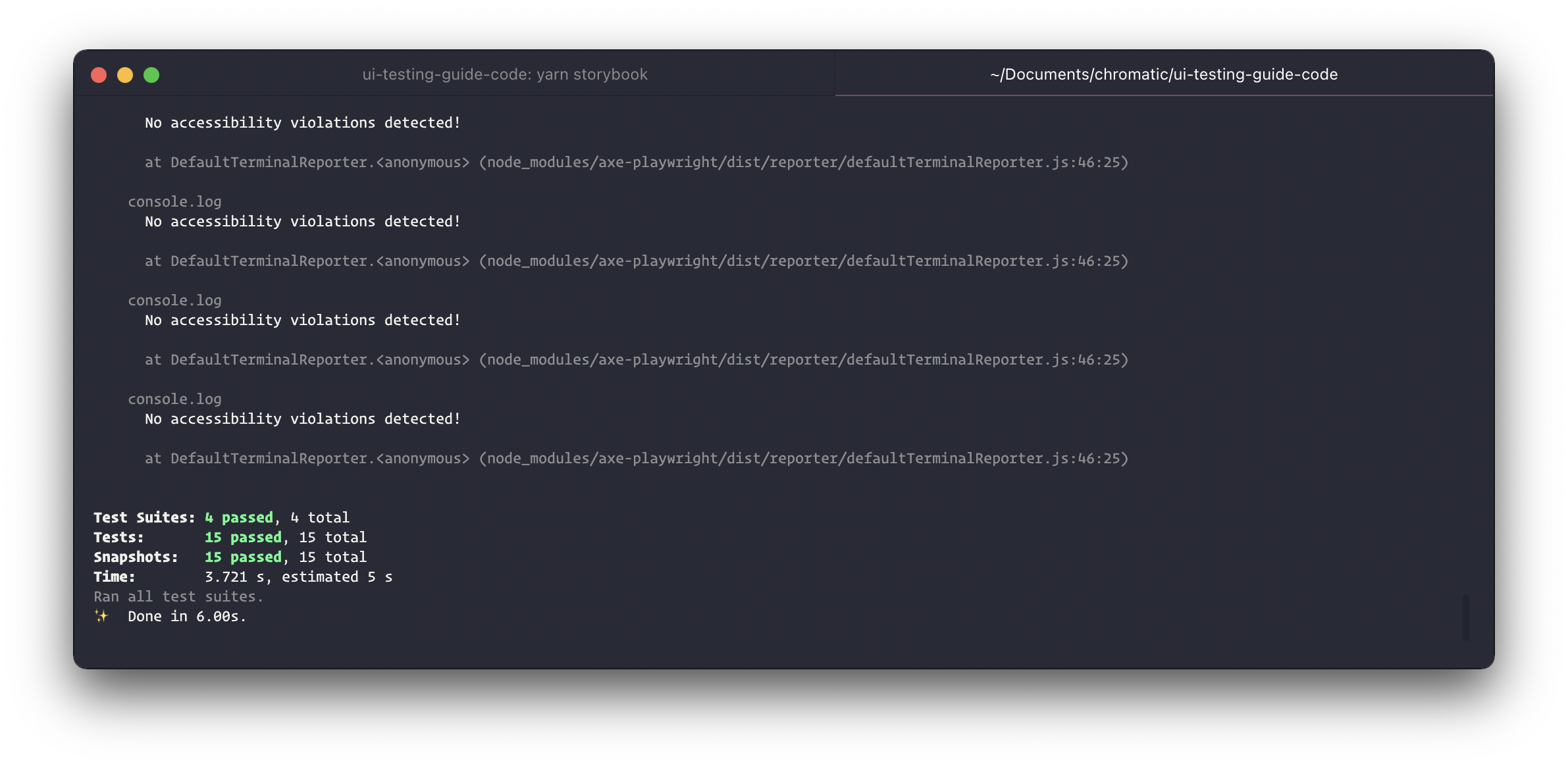 Often, changes to a component can unintentionally introduce new accessibility issues. To catch such regressions, you'll want to test all your stories before opening a pull request. However, the Accessibility addon only runs checks when you’re viewing a story. To test all stories at once we can use the Storybook test runner. It’s a standalone utility (powered by Jest and Playwright) that checks for rendering errors in stories.